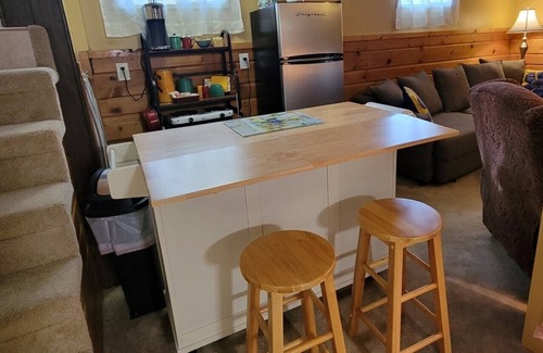 A basement apartment with a queen bed in bedroom, a second bedroom has a twin bed and the living room couch folds out to a queen bed. The kitchenette has a fridge, hot plate, microwave and toaster oven, electric frying pan, small crockpot and a small breakfast bar with seating for 2. Please note that there is NO oven. Laundry room is available and SHARED with upstairs host, if needed, with notice.