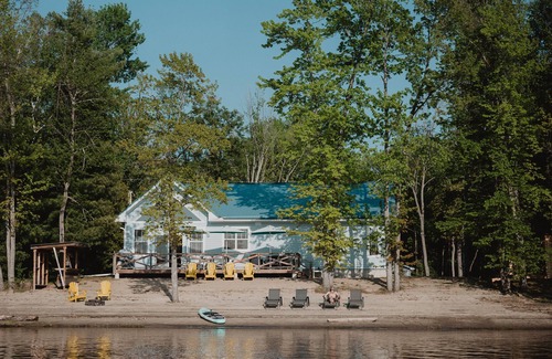 This 4-season waterfront chalet on the Ottawa River features a large deck overlooking a sandy beach with a tiki bar, sauna, and stunning sunset views. Enjoy all day sun lounging on the private sandy beach along 150 ft of waterfront with gradual entrance into the water. We've got stand up paddleboards, a kayak, an outdoor firepit, cornhole game, a beautiful indoor fireplace and a wood-burning outdoor sauna.