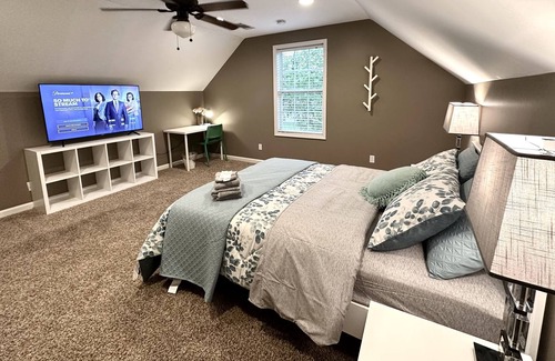 Just minutes to downtown Buford and Sugar Hill,it is newly renovated ! This spacious bedroom ,with a shared full bathroom. It will share a fully stocked kitchen, dining areas with other guests.This is a newly renovated bedroom.