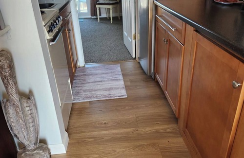 Freshly painted, new vinal composite flooring in living room, new carpet in bedroom (May, 2024), clean bathroom with a tile floor, and clean galley kitchen.