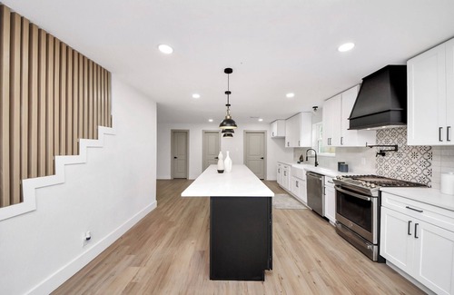 This getaway features four spacious bedrooms, each with a smart TV, plus two full bathrooms and a half bathroom downstairs, a fully equipped kitchen, a cozy living room, and a welcoming dining space. Outside, enjoy an open backyard with natural shade to enjoy a relaxing Sunday afternoon.