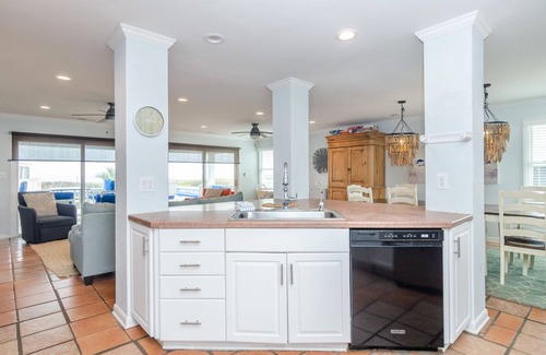 Take the spiral staircase up to the main living level to join in on the stunning views and enjoy the large gathering space. An open floor plan makes the great room an exceptional place to congregate for movie nights, family dinners, or evening board games. The living room offers several cozy seating options and a 65-inch roku TV. Double sliding glass doors lead out to the ocean facing deck and provide the perfect back drop for your favorite home cooked meal. An exterior spiral staircase will guide you to the roof top deck with endless breezes and expansive views. Enjoy lounging around in the sunshine, outdoor dining, or rocking in the breeze with your favorite cold beverage.