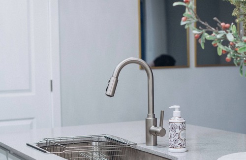 Kitchen includes coffee maker, smoothie blender, mixer, basic spices, and more