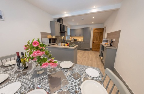 Entering the property through the front door, a hallway leads to all reception rooms. To the right, the smaller of the two lounge areas is still substantial in size, with a leather sofa and two armchairs finished in green with wood detail. The green colour scheme runs through the décor with the feature wall and soft furnishings following the theme. Quarry tiles are laid to the floor and a large fireplace sits to the centre of the feature wall with an electric wood burner effect fire. This snug is a cosy space to snuggle up with a good book, or catch up on some TV. To the opposite side of the hallway, a large and sociable kitchen diner features modern units along with a large dining table located to one end. The U-shaped kitchen units finished in a grey wood effect feature a pale wooden worktop housing a double oven and electric hob, built in dishwasher, fridge freezer and plenty of storage space. With wood strip flooring, bright white walls and spotlights, this modern and contemporary kitchen is a fabulous room to cook up some hearty breakfasts or dinners, and socialise at the end of a busy day exploring. A separate utility room houses a washing machine, ideal for longer stays.