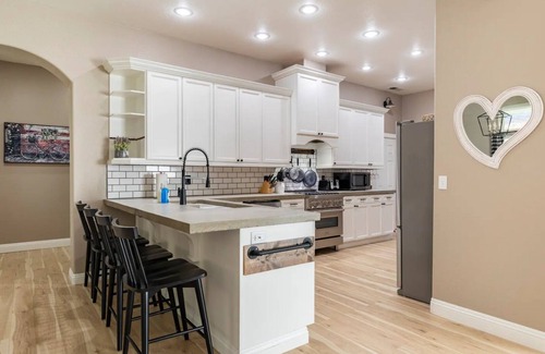 This fully remodeled house features polished concrete kitchen counter tops, new appliances, a pantry room with a coffee bar featuring an amazing Nespresso Vertuo machine stocked with coffee/espresso pods, and a frothier. The dining room has a beautiful custom wooden table for 8 people.