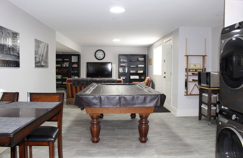 Large 2 bedroom guest accommodation. 1400 square feet with separate entrance. Quiet and private! Primary bedroom has a queen bed and can easily accommodate a playpen for new parents [available upon request]. Second bedroom has comfy twin beds. Great-room-style living room with pool table [available for adult guests upon request]. Large screen TV with cable and high speed Wifi. New kitchen features five new appliances. Located close to recreation and transit.
