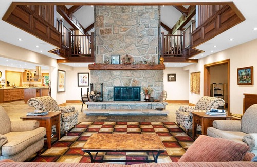 Inside, the home is designed with entertaining in mind. The kitchen is ideal for preparing gourmet meals, and the expansive dining area comfortably seats family and friends. Whether it's hosting a dinner party or enjoying a cozy family meal, this space sets the stage for memorable gatherings. For an intimate evening, retreat to the bar area for cocktails, or indulge in a friendly game night by the 28-foot stone fireplace that anchors the great room, creating a warm, inviting ambiance.