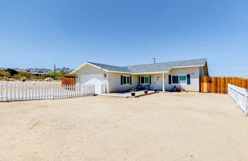 From the moment you enter, you'll feel right at home. We've fully equipped the home with our guest in mind. You'll have everything you need to enjoy the perfect getaway. This includes two bedrooms with a Queen bed in each, and two twin sized bunk beds in the third bedroom. The kitchen is fully stocked and ready for you to whip up a delicious meal. The backyard is fully fenced off perfect for bringing along your furry friends. We do allow max of two dogs only and we do have a pet fee of $45 per night and $150 flat fee with stays of 6 days or more, make sure pets are off the furniture The backyard also features a large inground pool, sun loungers, playground, outdoor dinning area, outdoor seating area, firepit, BBQ Grill, Beer pong table and hot tub. We are also perfectly located only 15 minutes from the Joshua Tree National Park entrance (29 Palms gate and 20 minutes from the Joshua Tree gate).
