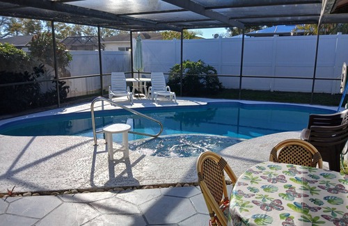 The Master Suite has a King Bed along with Dressers, Chests and A Walk in Closet. The Master Bath had Double Sinks, Walk-in Shower, a Bathroom and direct access to Pool Area. The 2nd Bedroom has a pool access door and a queen bed. There is a Screened Solar-Heated Pool w/Jacuzzi, The Living Room, has a (65" TV), High Def Cable, Leather Couches and an Easy Chair.