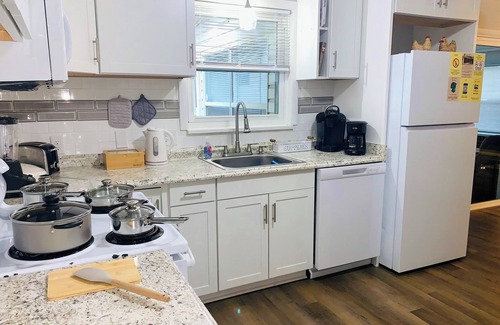 Fully equipped kitchen with microwave, Coffee Maker, Hot Water Kettle, Blender, Toaster and Sandwich Grill