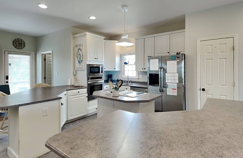 Upon entering the home, you’ll be welcomed into the foyer before ascending to the main living area on the second floor. This level boasts an extra-large, fully equipped kitchen with up-to-date appliances, perfect for preparing meals during your stay. The kitchen features breakfast bars on both sides, offering additional seating alongside a cozy sofa for lounging. The adjacent dining area is spacious enough to seat all your guests, making it a great spot for meals or gathering together. The living room invites relaxation with its large sectional sofa and chair, perfect for unwinding in front of the TV. A convenient half bath is located nearby.