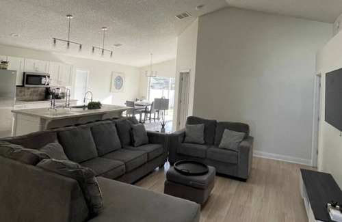 Welcome to our beautiful 4-bedroom, 2-bath house, the perfect vacation retreat for families and friends visiting the enchanting world of Orlando. Step inside and discover a modern open interior designed to provide you with comfort and style during your stay.