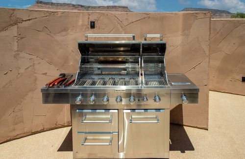 This Cliff Dwelling has 1 King bed and a sofa sleeper, an indoor bathroom with a shower, flushing toilet and a sink. Also inside the Kiva is a kitchenette with a small refrigerator, a sink, a dishwasher, a microwave and a Keurig coffee maker. We provide plates, cups, bowls and silverware. There is an open rooftop space that has a fire table and chairs, a gas BBQ grill and a hot tub.