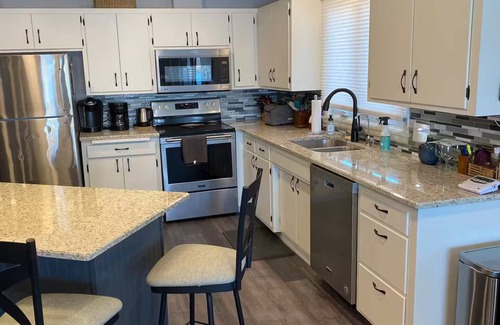 The kitchen is fully equipped, including baking sheets, crock pot, rice cooker, coffee machines, hot water kettle, coffee, tea, waffle maker, bowls, serving tray, plates, cups, mugs, utensils and wine glasses. Modern kitchen with granite countertops, new stove, dishwasher and microwave.