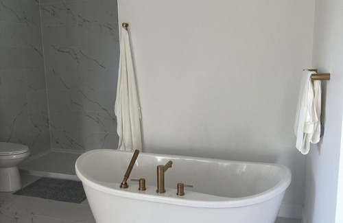 The first floor has a master bedroom with an attached luxurious bathroom with a free-standing tub and a shower.