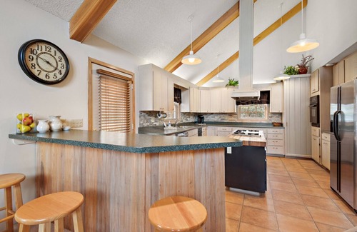 Altitude Adjustment is a two level home with a spacious open main floor with high ceilings with exposed beams and bright wood walls. The living room boasts a wall of windows that let in natural light and a large stone gas fireplace to cozy up to after a day on the slopes. The large leather sectional has 2 electrical recliners and offers plenty of seating. Kids will enjoy the multi-game arcade game with over 400 games on the main level. There is dining for six at the farmhouse table, with additional seating for three at the kitchen peninsula. You can enjoy seasonal mountain views from the expansive deck that encompasses the entire home or relax in the 7-person hot tub as you listen to the sounds of nature and enjoy the mountain air.