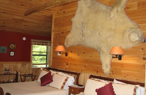 Expansive and airy, the Bear Room at Kiwassa Lake B&B, an Adirondack B&B, is located on the second floor, and is our only suite in the B&B with a fireplace and the only room that can accommodate up to four guests. This Adirondack suite is simple, elegant and tasteful with eastern exposure ensuring a bright and sunny morning. The decor is casual and contemporary influence meld with an emphasis on the Adirondacks. Guests of the Bear Room sleep below a life size bear rug hanging from the knotty pine interior while enjoying a relaxing, roaring fire. Located on the second floor, the eastern-facing windows look to Adirondack Kiwassa maples and forested acreage. For quiet nights, there is a sitting area in the Bear Room.