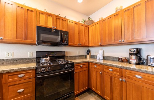 The full-sized kitchen is stocked with all the essential cookware and tableware to make a meal away from home and features slate floors and granite countertops. The dining area comfortably seats six and there are four additional seats at the breakfast bar. The first of two full bathrooms is located just off of the living area and has a pedestal sink and shower/tub combination. Both bathrooms are stocked with towels and an initial supply of toiletries. The private washer and dryer is near the entryway, and laundry detergent has been provided for your convenience.