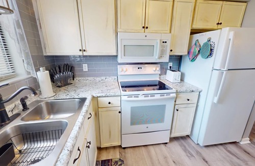 Step outside and breathe in the salt air—you're just steps from the sand. Enjoy a refreshing dip in the community pool, let the little ones splash in the kiddie pool, or stroll along the beach to the historic lighthouse nearby. Inside, you’ll find a fully equipped kitchen ready for beachside meals, complete with a blender, coffee maker, and all the essentials.