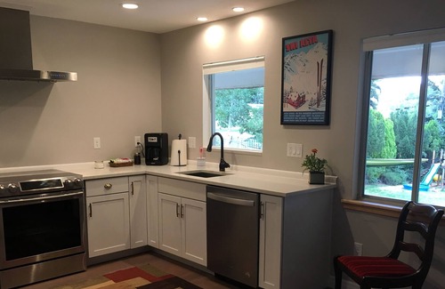 From the upgraded bedding to fully remodeled kitchen, this unit will surely impress! The newly updated kitchen has stainless appliances, quartz counter tops and all the tools you'll need to make meals away from home. The large living room is bright and comfortable with ample room for your group to relax. The shared yard boasts outdoor eating area and a play set to keep the kids entertained. The rental is the lower level of a duplex - stairs are required to access the single level unit (there is also a ramp on the west side of the house if you prefer). The lower level is a full walk-out and has full-sized windows - not your typical lower level.