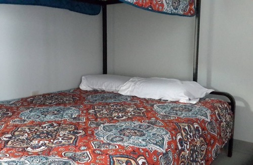 Two offices were converted into bedrooms, each 12 ft x12 ft. Bedroom #1 has one queen bed and Bedroom #2 has two heavy-duty 'Twin over Double' bunk beds. Each bedroom has two doors and no windows but sunlight comes in when doors are open. Although the quilted coverlets add a pop of color, the bedrooms still look like offices. Bring your slippers, socks or Spartan sandals as the building is carpet-free.