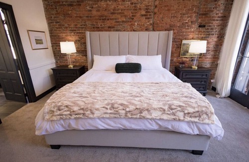 Step into The 1856 Speakeasy Suites – Room 2. Nestled within our boutique hotel, this exclusive space seamlessly marries historic charm with modern comforts, creating a unique haven for your stay. Positioned as one of only two rooms with a captivating view of Broad St, it offers the perfect vantage point for all downtown events. Featuring its private en-suite bathroom and a luxurious king bed, Room 2 invites you to indulge in a stay where sophistication and comfort intertwine seamlessly.
