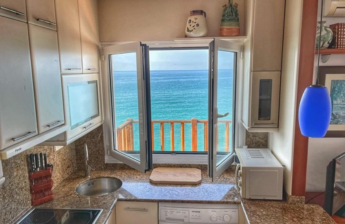 The apartment is perched on the cliffs just above the water with panoramic sea views, and the guest can hear the waves crashing against the rocks below the apartment, there is a 180 degree view of the sea, the beach and the marina.