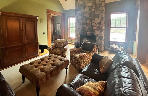 Award winning architect designed home with 3 master bedroom suites and 2 large bedrooms with bunk beds. Soaring ceiling in living room with beautiful hearth fireplace, open floor plan with dining room for 10 and additional seating for 6 more on sun porch and kitchen. Large family room in lower level with ping pong table. Beautiful lake views from all rooms in the house. Gazebo on lake with outdoor fireplace. Sandy beach with swimming dock, tennis court, row boat, 2 paddleboards and kayak available to guests. 15 minute ride to Mount Snow. Close to beautiful downtown Wilmington with boutique shopping and casual to fine dining options. Convenient location, less than 2 hours from Hartford, CT . Very quiet and serene area. For summer rentals on same day turnover, Linens and towels will be provided and folded on each individual bed (Beds will not be made)
