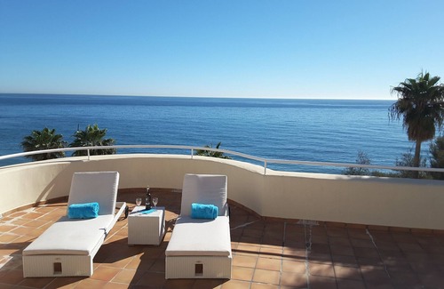 Magnificent and spacious apartment in FIRST LINE BEACH with air conditioning and perfectly equipped. Located in a very quiet urbanization with good access. Facing south, it has beautiful views of the beach, Gibraltar and the coast of Africa. Located between Estepona and the Puerto de la Duquesa. 100 m2 terrace, community pool all year round, paddle tennis court and community parking. Supermarkets a few minutes. Free WIFI.