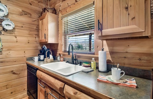 As you enter this cozy 1-bedroom, 1.5-bath cabin, you'll feel immediately welcomed by its inviting atmosphere, blending rustic charm with modern comforts. The first-floor living room invites you to relax with your favorite drink after a day of exploring. Upstairs, you'll find plush seating and a fireplace—perfect for snuggling up with family or friends on cool mountain nights.