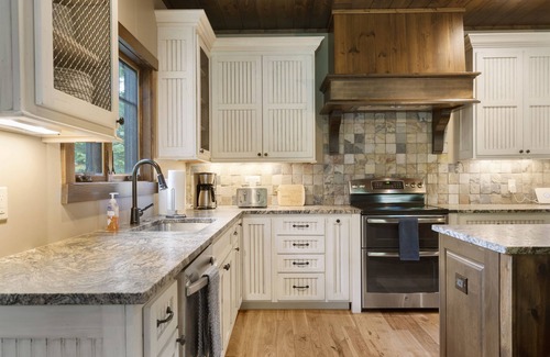 The master bedroom is tucked behind the kitchen, offering plenty of privacy, a large walk-in travertine tiled shower, and granite-topped double sinks. Lay in bed with views of the woods and ski slopes.