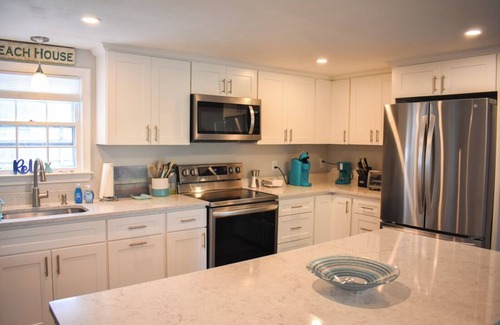 Spectacular three bedroom home with central air conditioning, located in sought after neighborhood. This contemporary home sleeping 8 is sure to be a family favorite you will want to return to year after year. The main living area opens up to a light and bright renovated kitchen, equipped with stainless steel appliances, quartz countertops, and an oversized kitchen island. There is also a secondary spacious living area next to the kitchen, featuring additional dining, comfortable seating with TV, and slider doors leading to the sunroom. The private back yard is the perfect setting to spend your summer evenings after a long day at the beach. Cozy on up next to the fire pit while toasting marshmallows! You are a quick drive to both North and South side beaches (both just over 5 miles away).