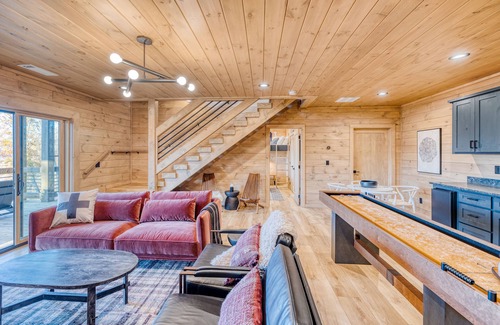 ☀ Lower level entertainment lounge with wet bar, 75" TV, shuffleboard table, arcade, golden tee, game table