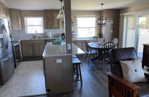 The kitchen has been totally updated with quartzite countertops, full-size, stainless appliances and tile flooring. Also included for your convenience are a dishwasher and disposal. The cupboards and drawers are fully stocked with everything you need to prepare a meal for family and friends. You will find cooking utensils, silverware, dishes (place setting for 8), glasses and many small appliances (coffee maker, blender, can opener, crock pot and toaster to name a few).