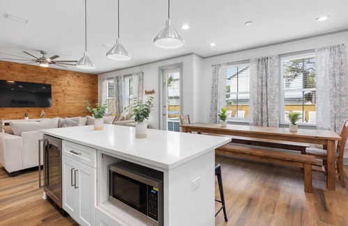 LIVING ROOM: This living area is very spacious and has ample seating, featuring 3 full-sized couches and a large flat-screen TV. The living room also has a view of the backyard and pool. The ship-lapped walls and trendy accent trim work give the whole living and dining area a very cozy, casual vibe. It’s the perfect place to gather with those you love!