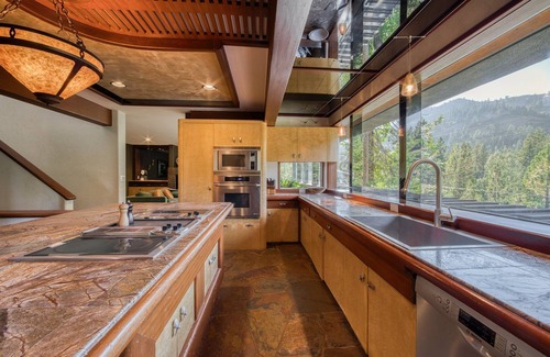 From the moment you step inside, you'll be captivated by the vacation home's distinctive spacious layout. The journey through the house reveals one surprise after another, culminating in some of the most stunning mountain vistas you've ever seen. Enter the heart of this Lake Tahoe vacation home, where the gorgeous kitchen awaits—an ideal space for entertaining. With a central island, stainless steel appliances, stone floors, and panoramic windows, the kitchen offers everything you need, plus jaw-dropping mountain views to enjoy while you cook and dine.