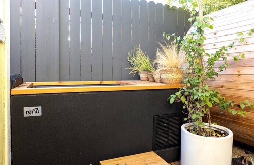 back yard with Renu Cold plunge, Barrel Sauna and outdoor firepit for stargazing and communing with the tall Eucalyptus that anchors the property. This house is a tuning fork for the weary, offering spiritual re-juvination to all who stay here.