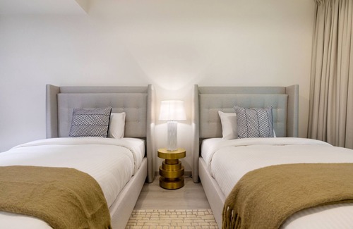 Boasting stylish decor and balcony access to engaging partial city views, the second bedroom of this beautiful apartment is perfect for two sharing. Furnished with two single twin beds and premium finishings, this bedroom offers you the right amount of relaxation after a full day out. This room has its dedicated bathroom to the left of the bedroom entrance for guests’ utmost convenience.