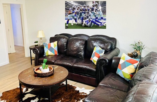 Your cozy getaway awaits in Arlington at this beautiful house. Leather Couches, 2 flat screen TV’s, Kurig DUO coffee maker, Hardwood floors, Quartz countertops. 6 blocks from AT&T Stadium. Freshly remodeled kitchen, bathroom, lighting, New Beds Hybrid Coil/Memory foam mattresses, linens, etc. High tech finishes; 1000 mbps Fiber Wifi, invisible ceiling fans, LED lighting, New backyard privacy fence. USB outlets, Great for Sports Fanatics & Concert Goers that want a hip retreat close to Local Venues. NOTICE : Landscaping under Renovation; on November 5th we re-did the front driveway which damaged the lawn near walkway. We are in the process of redoing landscaping, please pardon our progress.