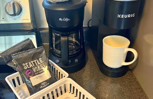 The kitchen includes all essential appliances—oven, stove, microwave, and refrigerator—and is stocked for all your cooking needs. Enjoy your morning coffee with the drip and Keurig coffee makers—coffee is provided. A small dining area seats 4 guests.