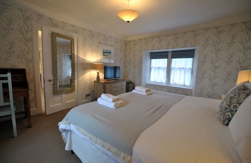 Set just behind the historic Toll Booth, St Anne's is well placed for the local butcher, bakers and selection of cafes as well as just being a few minutes' walk from the idyllic harbour where you can purchase freshly caught lobster and crab from the harbour shack. Entering this imposing property at ground level, there is a generous hallway which leads to the living spaces as well as access to the large south facing garden. The dining kitchen has a farmhouse feel with exposed stone walls and wooden beams. It is a well equipped kitchen with large dining table looking out to the garden with a separate access directly onto the patio. The dual aspect sitting room has an open fireplace- perfect for gathering around on cooler evenings- as well as a door to the patio which you can have open on warm summer days. Through a door cleverly disguised as a bookcase, a few steps lead down to the bunk room which is the ideal space for kids to hang out with a TV, beanbag seating and separate WC. A family bathroom with handheld shower attachment completed the ground floor and a sweeping staircase with high ceilings takes you to the first floor. Here. there are three good sized bedrooms. The main bedroom has a superking bed and enjoys views out to the garden as well as windows to the front which makes it lovely and bright. There are two twin bedrooms, one of which has an en-suite shower room.