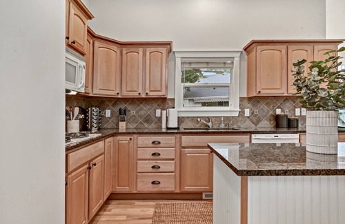 Inside, you'll enjoy the modern furnishings and bright and open floor plan in the common area with vaulted ceilings and sky lights. Watch a movie after a long day biking the Boise River Greenbelt on the comfortable living room furniture or sit back and enjoy the heat and ambiance of the gas fireplace after a day of skiing or hiking at Bogus Basin. Entertain and make tasty meals in the fully-equipped kitchen with granite countertops, a kitchen island, and double bay kitchen sink. Extend the whole space by walking out the back door to the covered back patio with outdoor dining table and enjoy the peace and quiet in the shaded and green backyard or take a seat at the dinette table on the front porch and gander at the pond across the way.