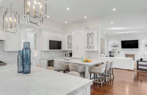 Gourmet kitchen featuring top-of-the-line appliances, custom cabinetry, and two large islands, perfect for entertaining.