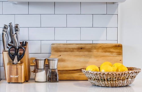 The fully equipped kitchen offers modern appliances, ample counter space, and a layout that flows into the dining and living areas, making meal prep a breeze.