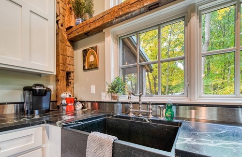 As soon as you enter the home you will be amazed by the attention to detail. Rough sawn oak planks, salvaged barn beams, a floating staircase and soaring vaulted ceilings with oversized windows throughout provide panoramic views. Step into the gourmet kitchen complete with soapstone counters, six-burner and griddle Wolf gas range, dual farmhouse sinks and center island with extra seating for four. Dining area features roomy farmhouse table with space for 10. Living room is located just off the kitchen/dining area and provides plenty of lounge space with cozy leather sectional. Additional living space is tucked away with flat screen tv and additional seating. Amazing cantilevered deck leads out over the wooded ravine where you can view deer and wildlife while enjoying your morning coffee. Main floor master has king bed and en suite bath featuring a walk in shower and double sinks. Bunk room with twin over full bunk is located on the main floor as well as an additional full bath with vintage clawfoot tub.
