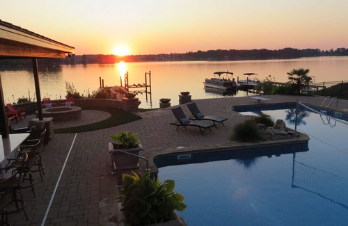 Step outside to the most beautiful, big water view of the lake! The resort feel includes a large double pool for volleyball, relaxing or diving! Putting green to stay in practice! Fire pit & hot tub for cozy evenings. Outdoor cabana with 2 TVs, galley fridge, bathroom and more. The sunrise views & moon reflecting off the water can't be beat! You'll think you're in the Caribbean.