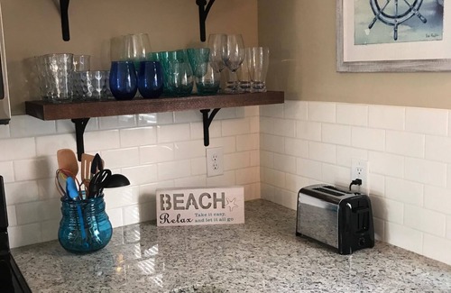 Inside, you'll find a spacious living area, complete with comfortable coastal furnishings, a new queen bed, wifi and a flat-screen TV with cable. The large bathroom, features a powerful shower, as well as a washer and dryer for your convenience. Food lovers will be delighted by the pretty, fully-equipped open kitchen, featuring new cabinets, granite countertops with a large bar seating area, a dishwasher, refrigerator, microwave, and stove.
