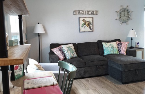 Watch the waves crash while enjoying your favorite drink on the deck. Just steps from the beach and great restaurants! Large open concept (newly updated) kitchen w/ breakfast bar open to living room area. Unlimited high speed internet and smart TVs in each room (If you spend any time inside)