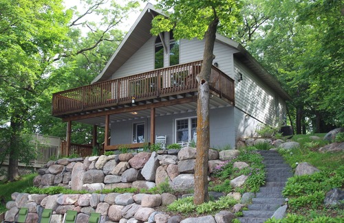 Beautiful chalet style home on 75 feet of excellent shore line. Gorgeous views from the lake side deck where you can enjoy the sunsets. deck wraps around the home for plenty of out door living space. Home is fully furnished and has everything you need to enjoy your stay, including BBQ Grill and out door dining area. The master bedroom is on the main level and has a King size bed and walk through 3/4 bath. The second bedroom is located in the loft and has a full size bed, twin bunk beds and a private seating area. Enjoy a cozy evening in the vaulted living room by the gas fireplace and incredible lake views through the wall of windows. Enjoy a movie on the flat screen tv and blue ray player. The kitchen is stocked for all your cooking needs, including a microwave and dishwasher. The lower level family room has 2 twin sized pull out beds for more sleeping space and has a walk out to a covered patio area. Lower level also has a full bath and washer and dryer. Beautiful boulder retaining walls and granite steps guide you to the lake. Comfortable lawn chairs are provided on the lake shore for your enjoyment. Great swimming!