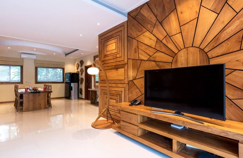 All 3 bedrooms were located almost next to each other, each are equipped with their own bathrooms. Inside the master bedroom, you can relax yourself above a queen-size luxury bed, watching television or having a peaceful dip inside a beautiful bathub. The tall glass door provides enough lights and fast access to the swimming pool outside, making your best view from the bed irresistible. Soft pillows, high quality linen and a beautifully appointed room all make for the type of nights sleep only possible on a holiday.